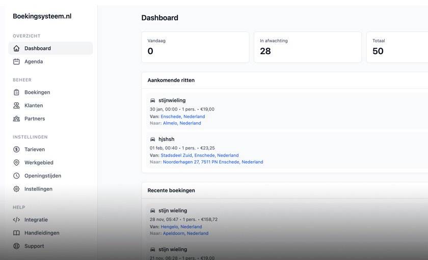 Professioneel online boekingssysteem speciaal voor taxibedrijven. Inclusief online betalingen, administratie dashboard, facturen, en uitbesteding naar partners. Direct te gebruiken op uw eigen website.